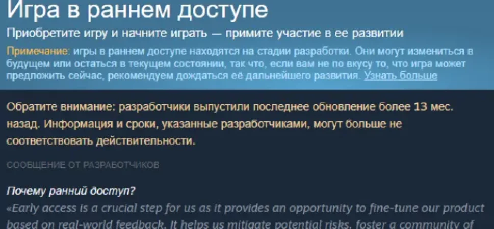 Ранний доступ – это спасение для амбициозных проектов, которые делают небольшие студии. Но сколько из стартовавших в нем дожили до релиза? Я таких данных не нашел, но думаю, что не мало проектов канули в небытие, хоть за них и заплатили. Чтобы защитить пользователей от покупки заброшенных проектов, застрявших в стадии «вечной альфы», Valve внедрила новую систему предупреждений для игр в раннем доступе Steam, которые давно не обновляются. Предупреждение появляется на страницах игр, не получавших обновлений более года, и указывает, как долго разработчики игнорировали проект. Также Valve предупреждает, что сроки выхода из раннего доступа, указанные авторами, могут быть устаревшими.